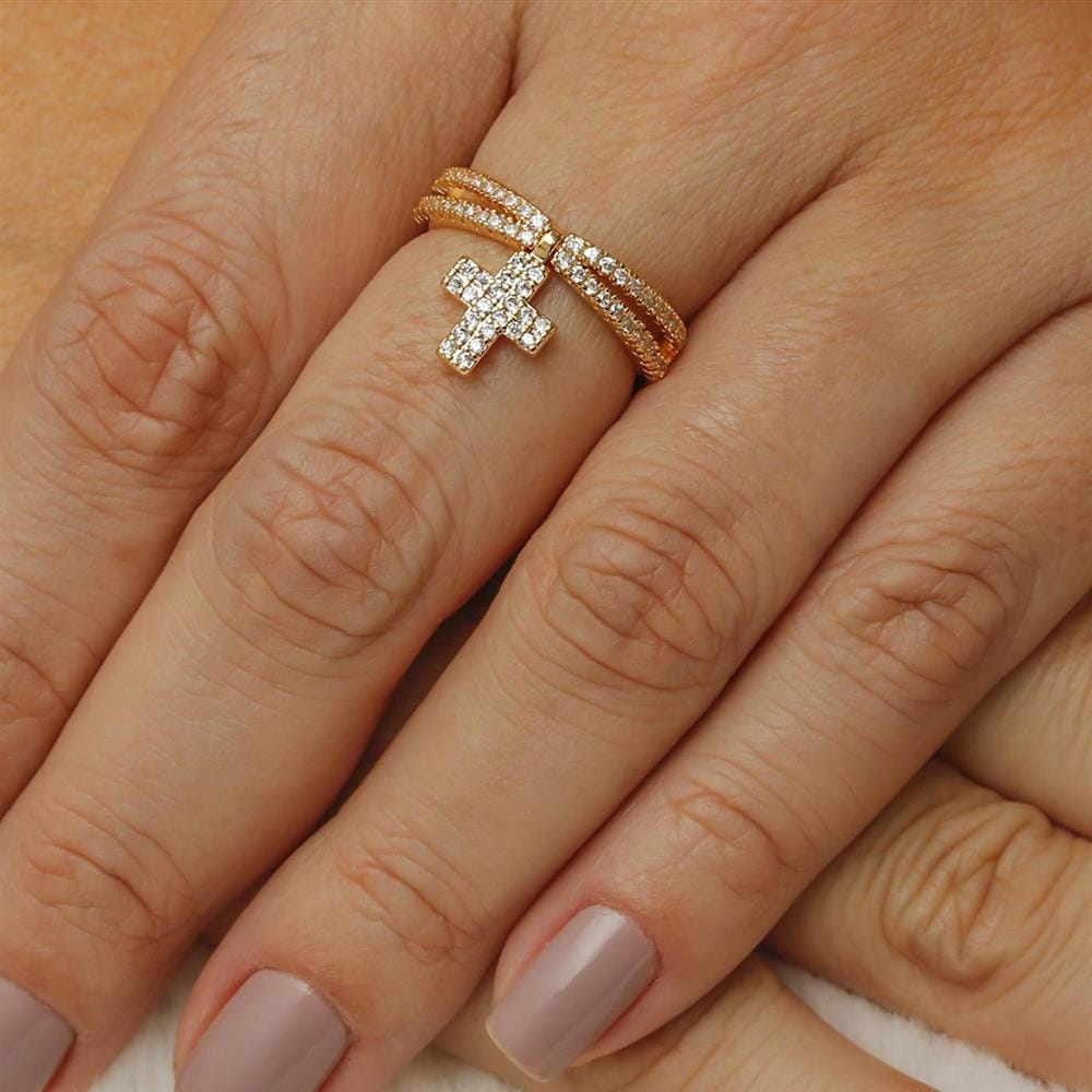 Folheado a Ouro 18K, o anel possui um acabamento durável e requintado, ideal para quem aprecia joias com detalhes significativos. O pingente de cruz é um símbolo de fé e proteção, tornando esta peça não só um acessório de beleza, mas também de valor emocional.