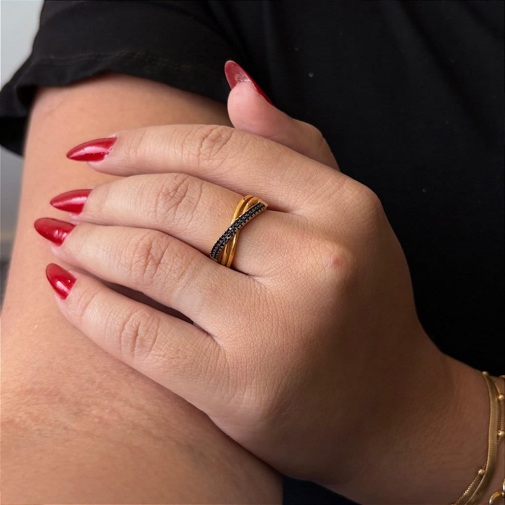 Anel 2 Fios Lisos E 1 Cravejado Com Zircônias Pretas Trançados Folheado a Ouro 18K