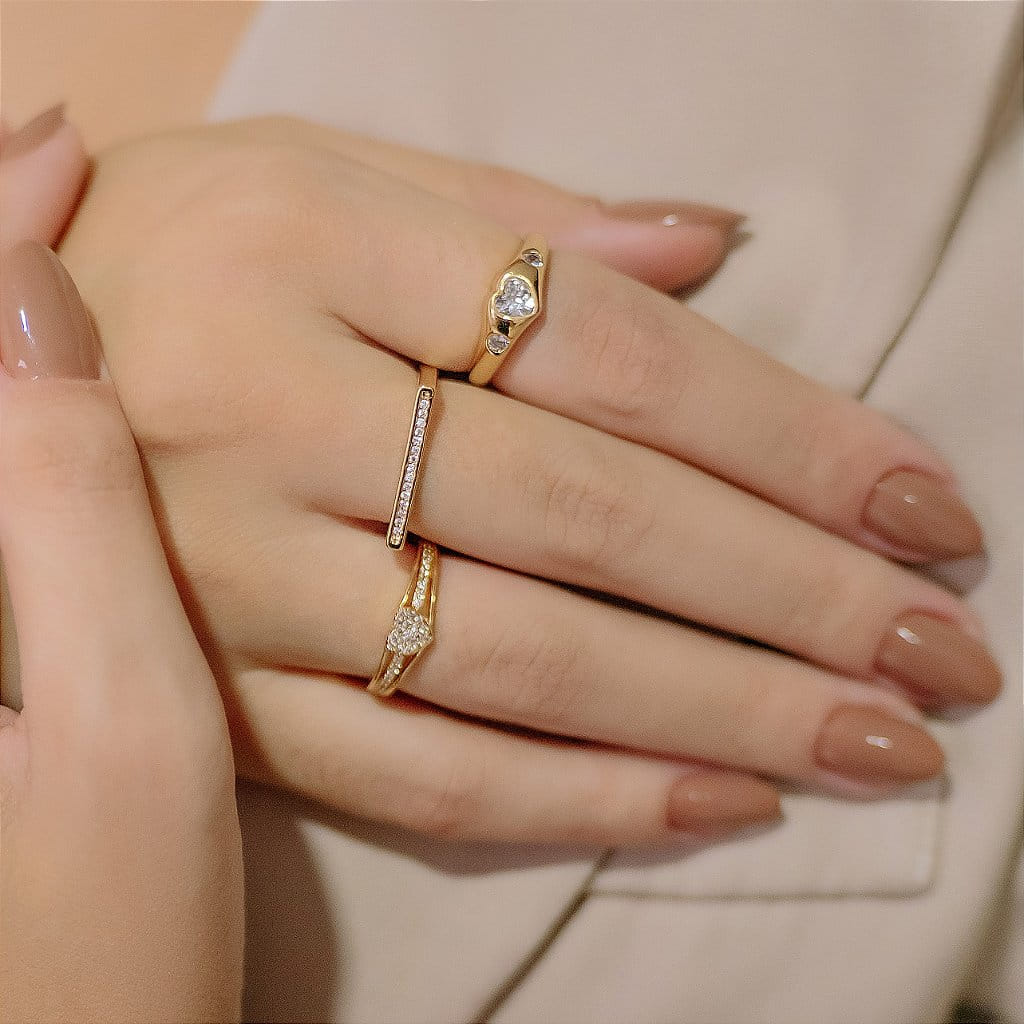 Este anel encantador apresenta um design com três fios e um coração cravejado, perfeito para quem busca um acessório romântico e elegante. Folheado a ouro 18k, o anel é confeccionado com materiais de alta qualidade, ideal para adicionar um toque especial e sofisticado ao seu visual.