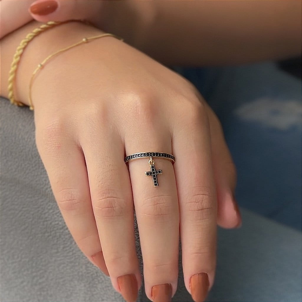 O Anel Aliança Inteira com Pingente de Cruz, cravejado com Zircônias Pretas e folheado a Ouro 18K, é uma peça de joalheria que combina fé, elegância e sofisticação de maneira única. Com seu design de aliança inteira cravejada de zircônias pretas e um delicado pingente de cruz, este anel oferece um visual imponente e sofisticado, perfeito para quem deseja um acessório que simbolize sua espiritualidade com estilo.
