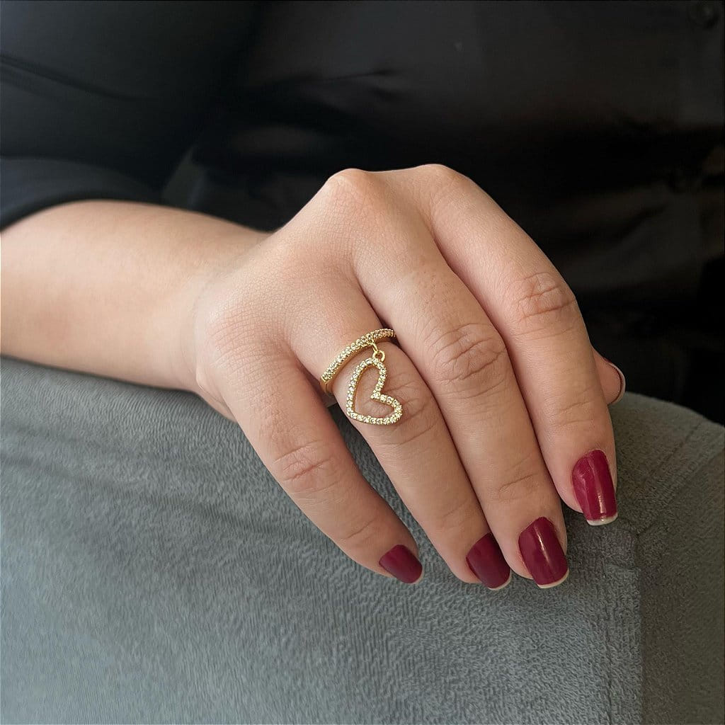 Descrição: O Anel Aparador Pingente Coração Cravejado Folheado a Ouro 18K é uma joia encantadora que combina elegância e delicadeza. Este anel apresenta um design único com um pingente em formato de coração cravejado com zircônias, que adiciona um toque de brilho e romantismo à peça. É perfeito para ser usado como aparador de alianças ou como uma joia independente que simboliza o amor e a sofisticação.