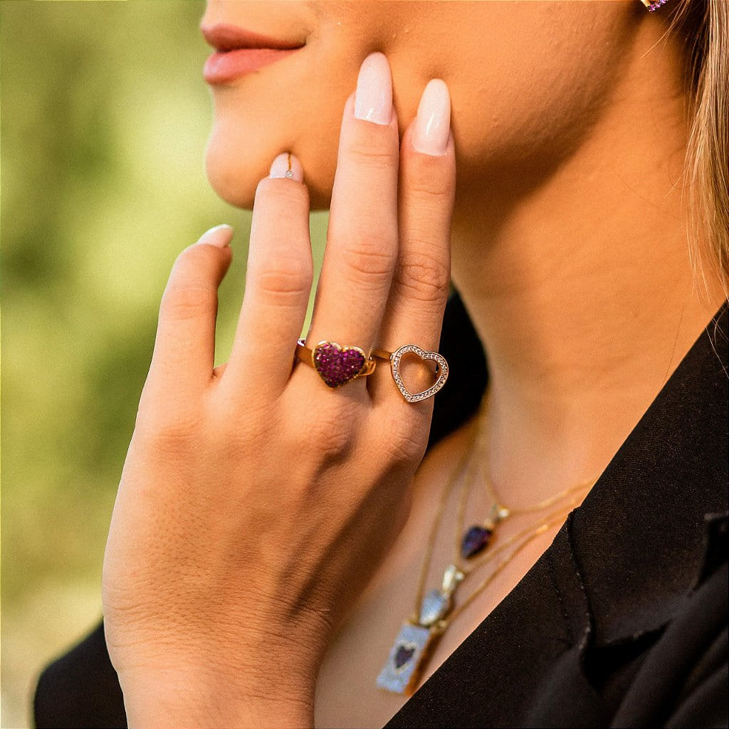 Anel Coração Pavê Rosa Grande Folheado a Ouro 18K