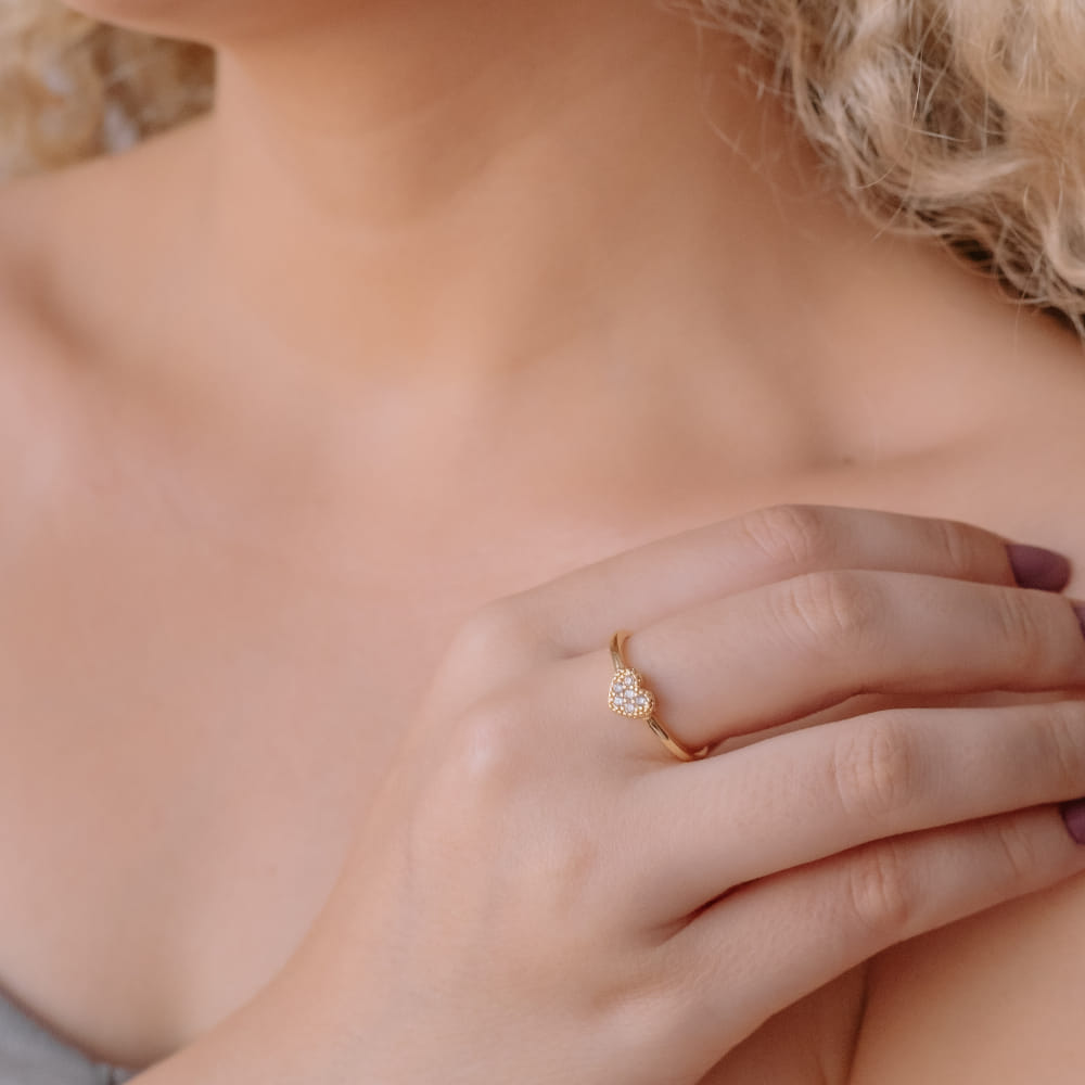 Descrição: O Anel Coração Pequeno Cravejado Folheado a Ouro 18K é uma joia encantadora que simboliza o amor e a elegância. Com seu design delicado, este anel apresenta um coração cravejado de brilhantes, proporcionando um toque de sofisticação ao seu visual.
