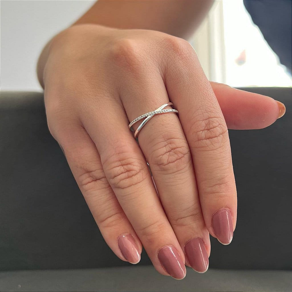 Anel Fio Liso e Fio Cravejado Cruzado em X Folheado a prata 925