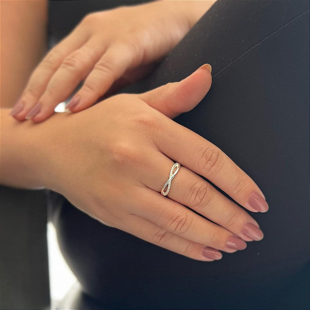 Anel Fio Liso e Fio Cravejado Entrelaçado Formando Infinito Folheado a prata 925