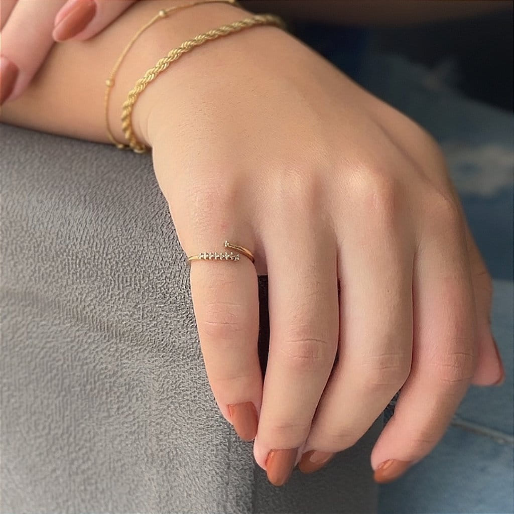 O Anel Fios Cravejados Regulável, folheado a Ouro 18K, é uma peça de joalheria que une versatilidade e sofisticação de maneira impecável. Com seu design composto por fios delicadamente cravejados com zircônias brilhantes, este anel oferece um visual elegante e contemporâneo. A característica regulável proporciona um ajuste perfeito e confortável, adequado para diferentes tamanhos de dedos.