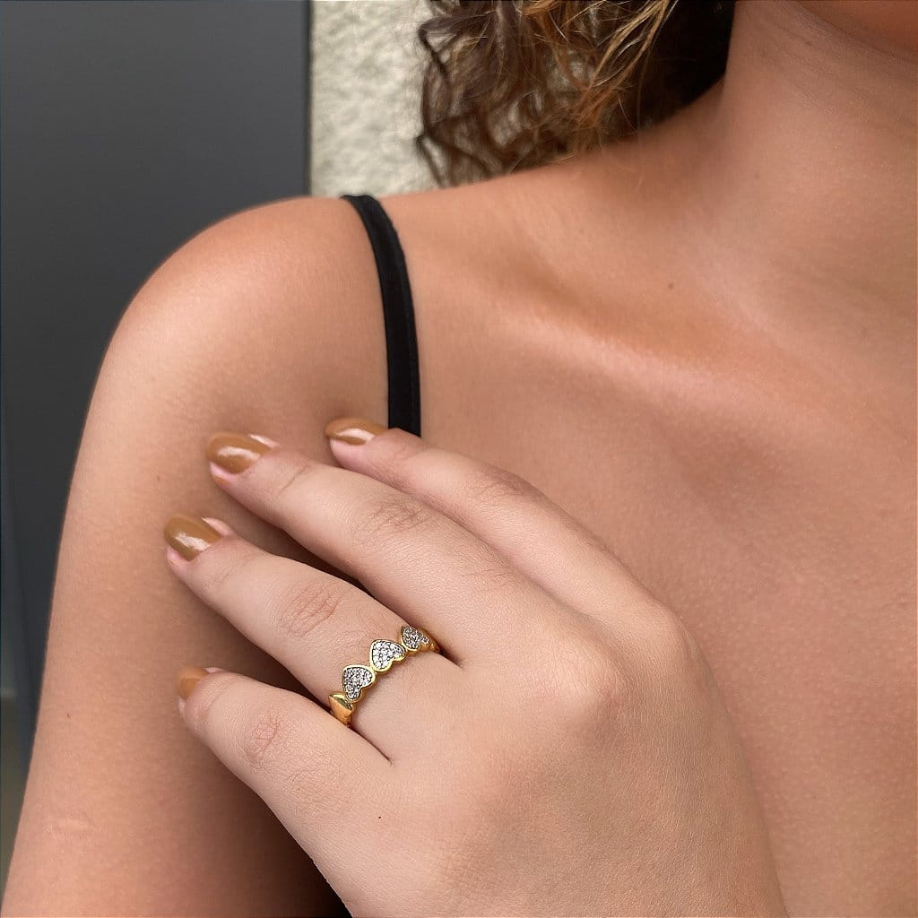 O Anel Inteiro Corações Lisos e Cravejados, folheado a Ouro 18K, é uma peça de joalheria que combina delicadeza e brilho em um design encantador. Com corações alternados entre lisos e cravejados com zircônias brilhantes ao longo de toda a extensão do anel, esta peça oferece um visual romântico e sofisticado, perfeito para quem deseja um toque de glamour e amor em seu estilo.