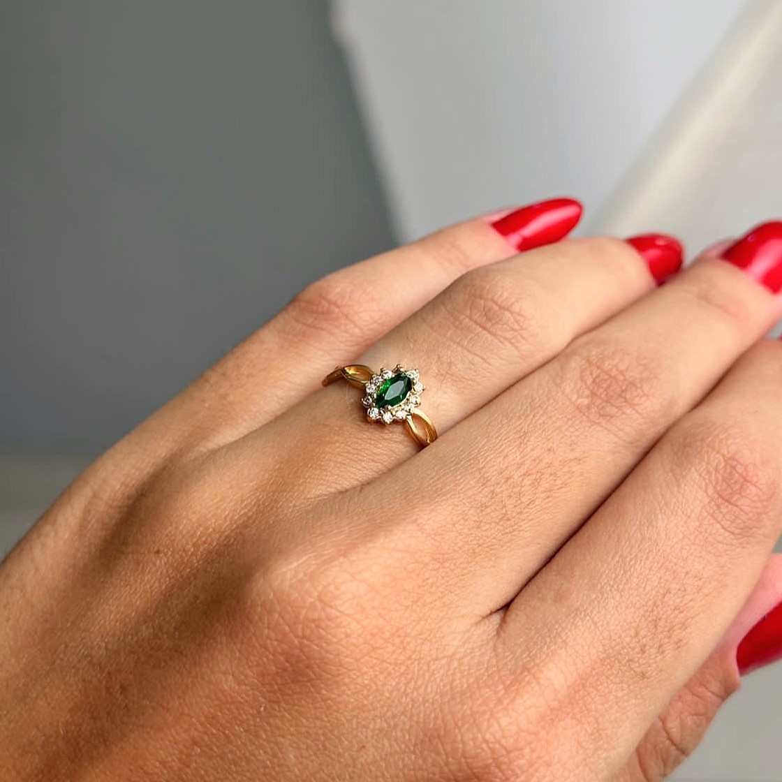 Anel Navete Verde Borda Cravejada Aro Trançado Folheado a ouro 18K