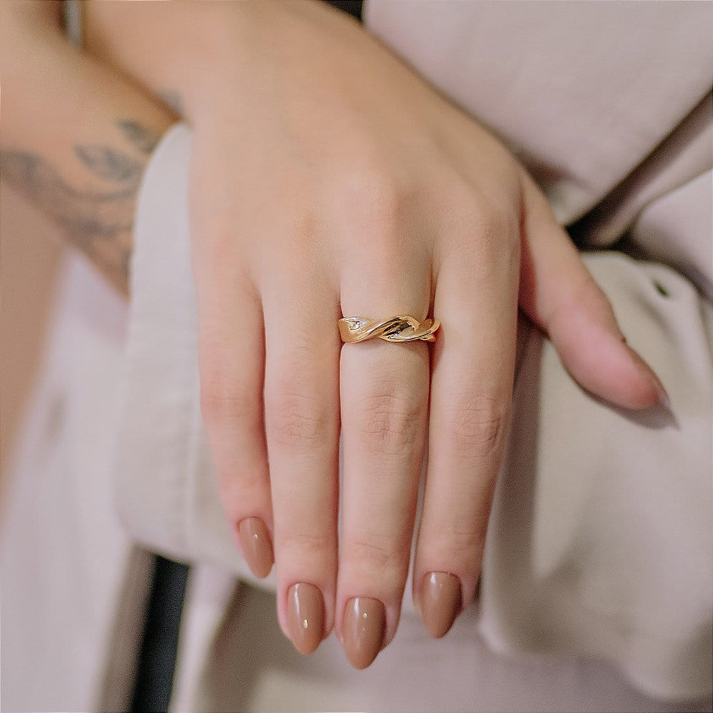 Este anel apresenta um design de ondas orgânicas, perfeito para quem busca um acessório único e sofisticado. Folheado a ouro 18k, o anel é confeccionado com materiais de alta qualidade, ideal para adicionar um toque especial e elegante ao seu visual.