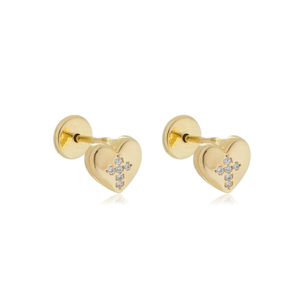 Brinco Coração Liso Cruz Cravejado Folheado a Ouro 18K