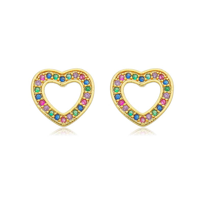 Brinco Coração Vazado Cravejado Rainbow Com Borda Dourada Folheado a Ouro 18K