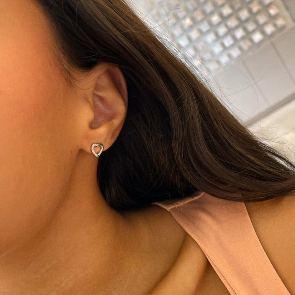 O formato de coração traz metade do desenho em acabamento liso e a outra metade com zircônias cravejadas, criando um contraste elegante entre o visual clean e o brilho sofisticado. O tamanho médio garante presença no look, sem perder a delicadeza.