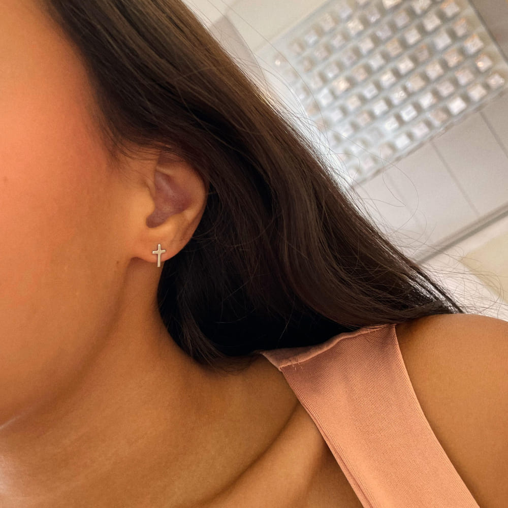 Delicado, moderno e cheio de significado, o Brinco de Cruz Lisa folheado em Steel é perfeito para quem ama acessórios discretos com valor simbólico e visual sofisticado.