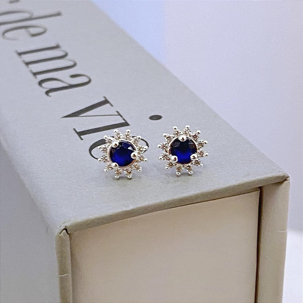 Brinco de Flor Pétalas Cravejadas e Zirconia Azul Central Folheado a Prata 925