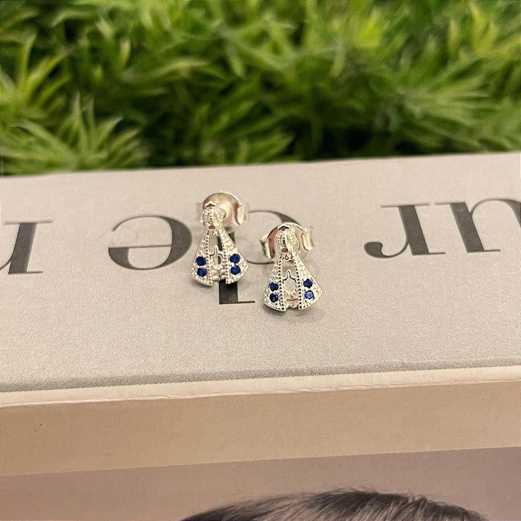 Brinco de Nossa Senhora Cravejado com 4 Zirconias Azuis Folheado a Prata 925