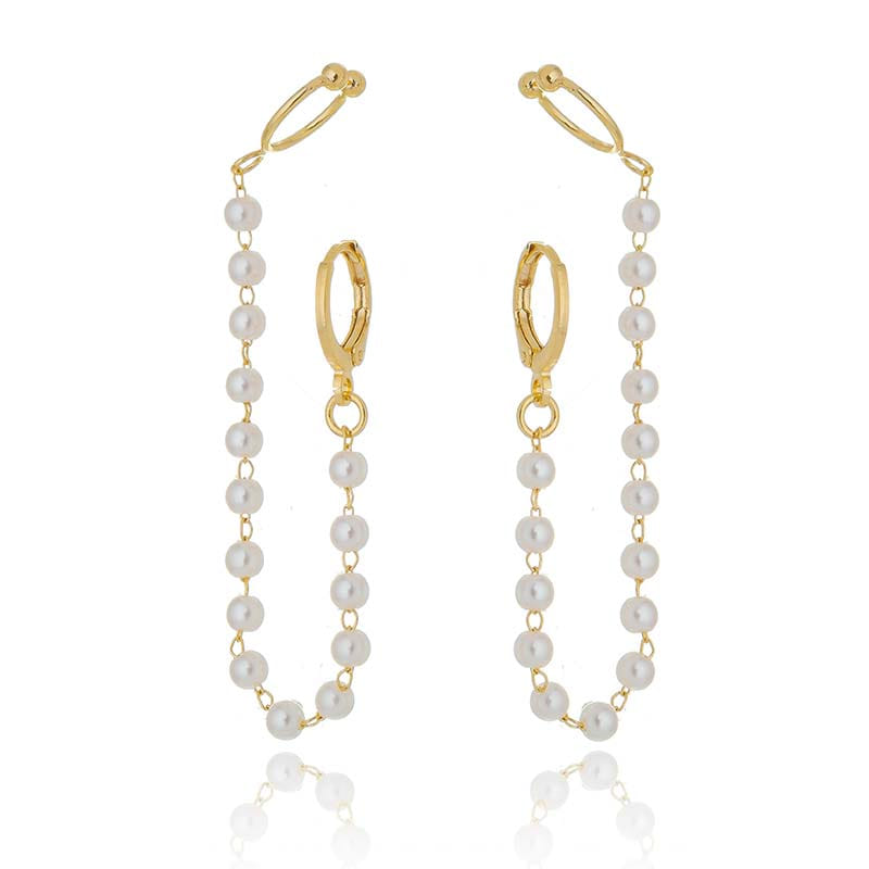 Brinco Earchain Corrente Pérolas Piercing Fake Folheado a Ouro 18K