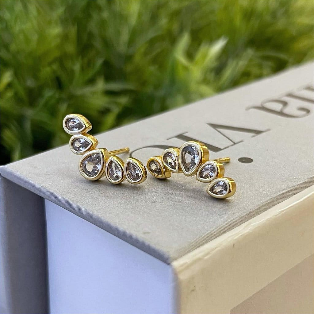 Brinco Earcuff Gotas Cristal Folheado a ouro 18K