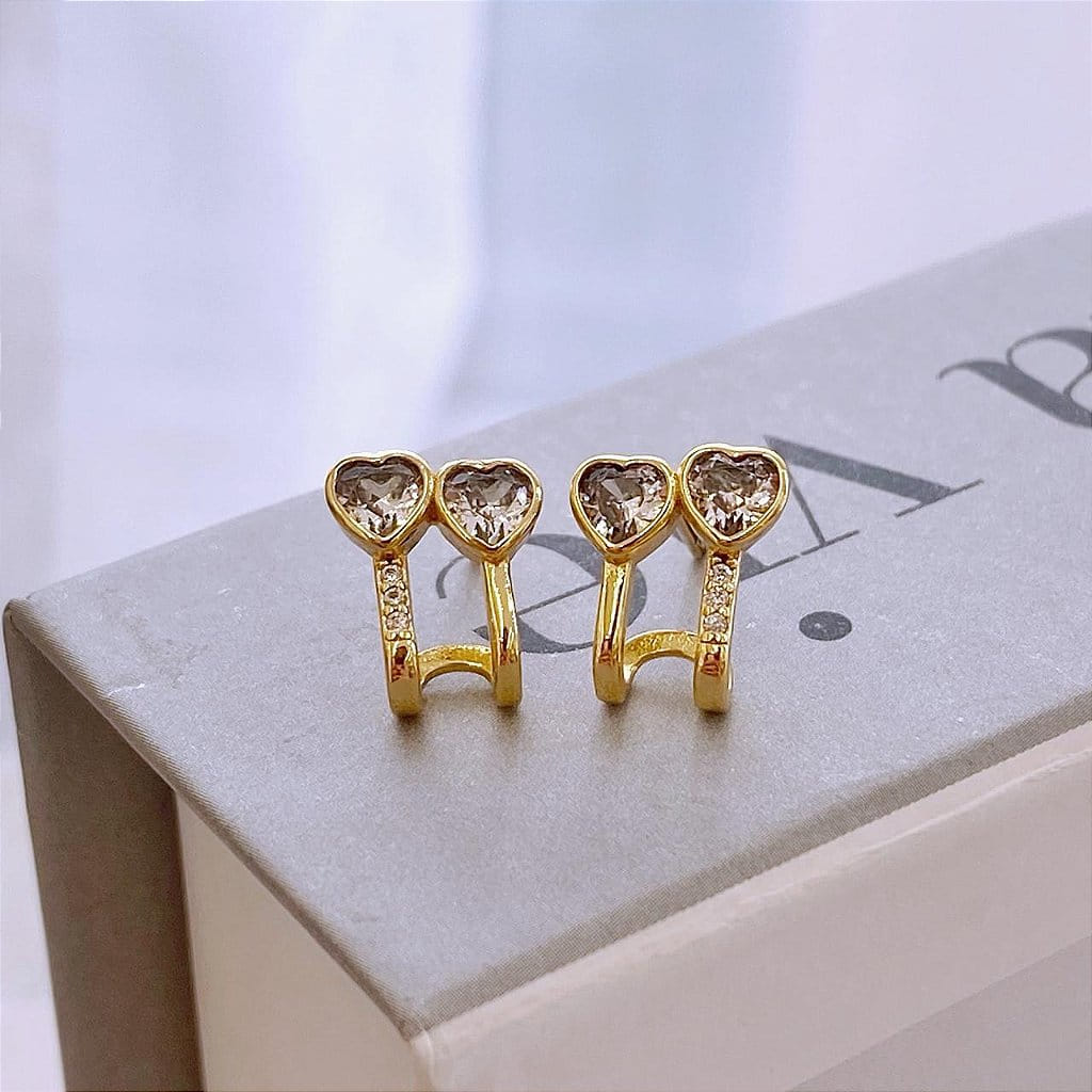 Brinco Earjacket Fio Liso e Fio Cravejado e Dois Corações Cristal Folheado a ouro 18K