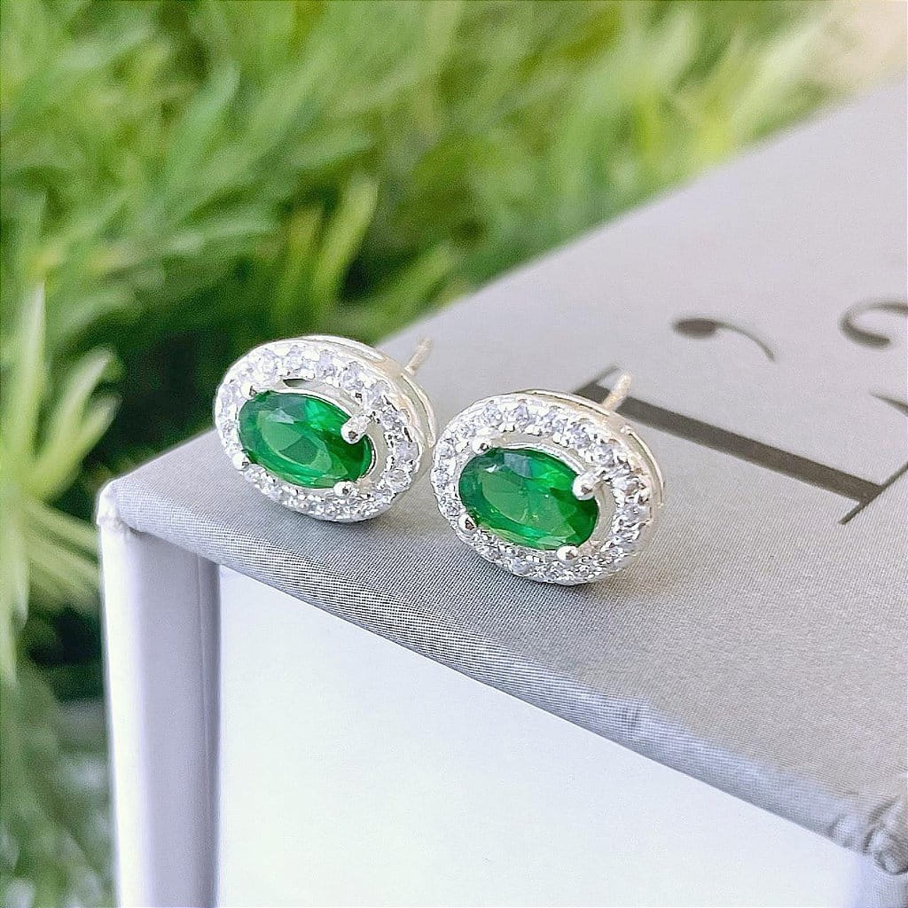Brinco Oval Verde com Borda Cravejada Folheado a Prata 925