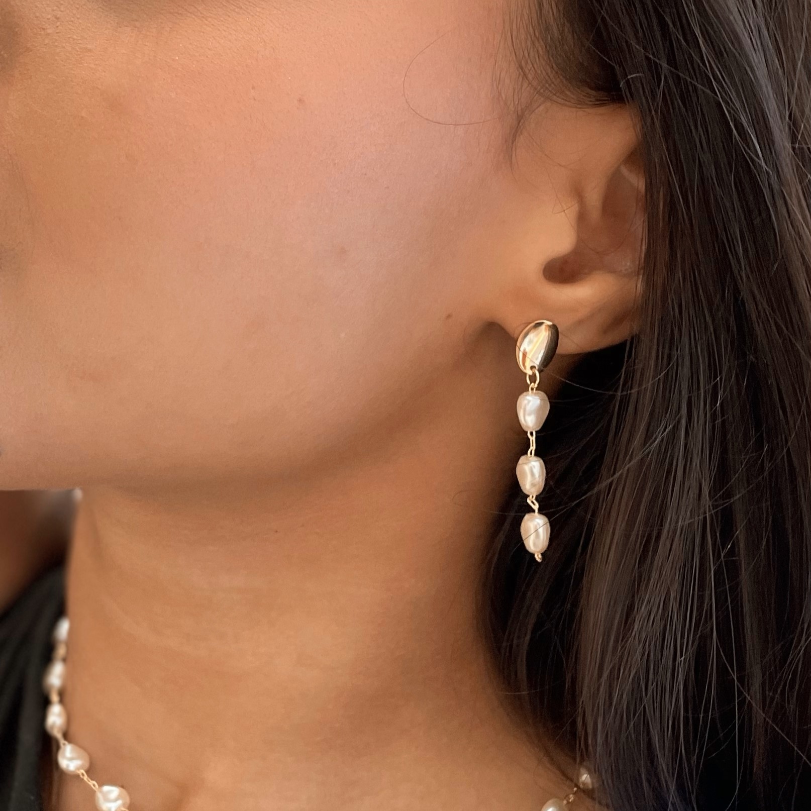 Brinco Pendente 3 Pérolas Organicas com Base Ovalada Folheado a ouro 18K