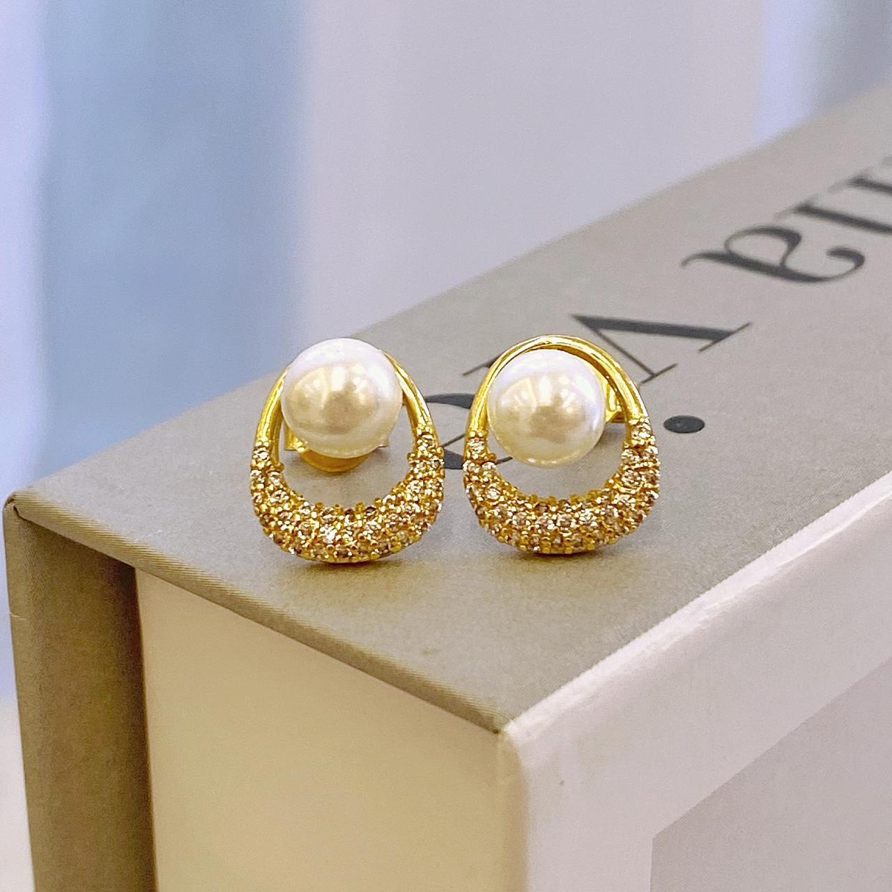 Brinco Triangulo Arredondado Base Cravejada e Pérola Central Folheado a ouro 18K