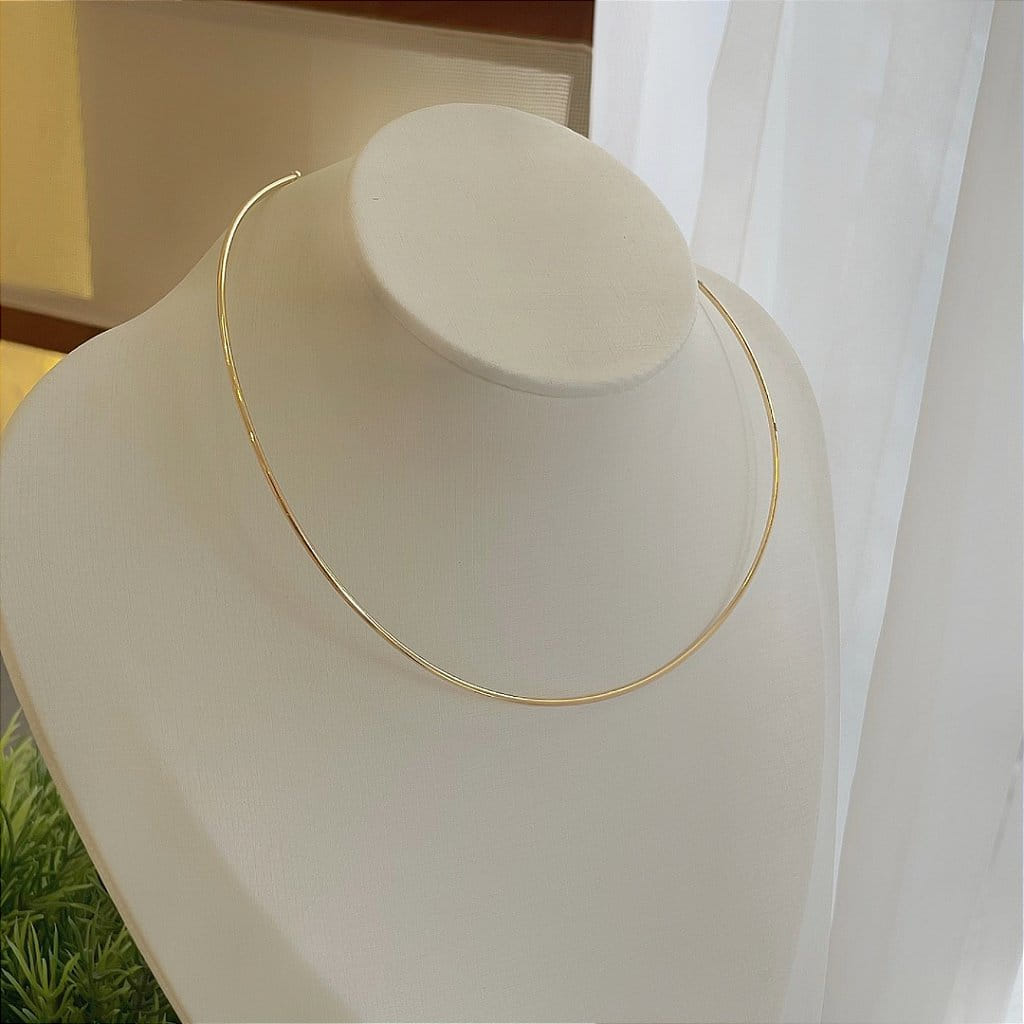 A Choker Aro Fio Liso, folheada a Ouro 18K, é uma peça elegante e minimalista, ideal para quem busca um acessório com design clean e sofisticado. Com um formato rígido e acabamento liso, esta choker destaca o colo com um brilho refinado, sendo perfeita para complementar diferentes estilos com sutileza e elegância.