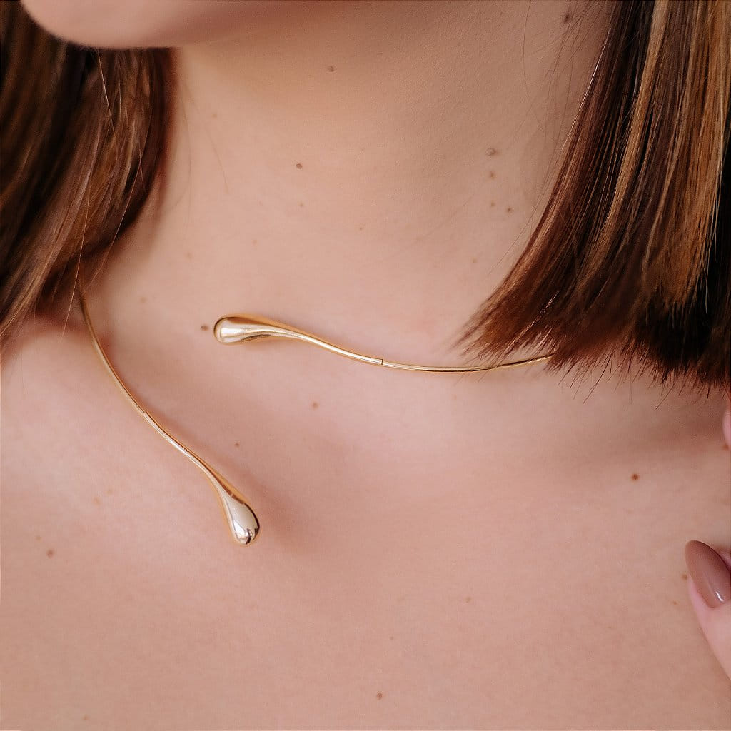 Esta choker elegante apresenta um aro com gota orgânica lisa, ideal para quem busca um acessório sofisticado e moderno. Folheada a ouro 18k, a choker é confeccionada com materiais de alta qualidade, perfeita para adicionar um toque de elegância ao seu visual.