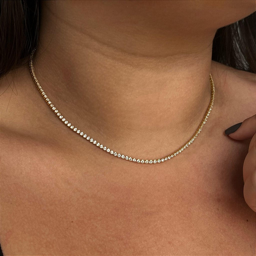 O Colar Riviera Redonda de 40cm com pedras de 2mm, folheado a Ouro 18K, é uma peça de joalheria que exala sofisticação e brilho. Com um design clássico e elegante, composto por pedras redondas que brilham intensamente, este colar oferece um visual luxuoso e refinado, perfeito para qualquer ocasião especial.