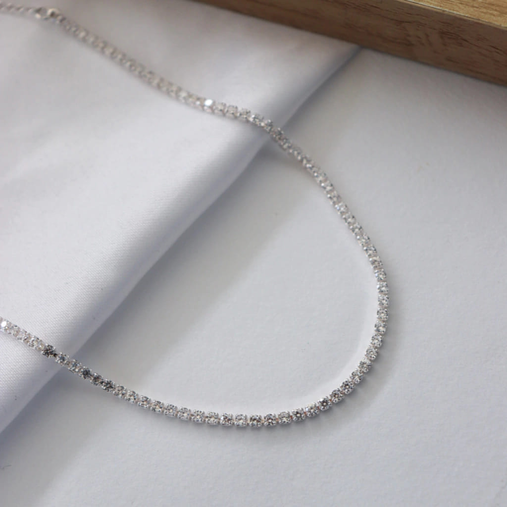 Com zircônias redondas cravejadas ao longo de toda a extensão, o colar cria um efeito de brilho contínuo e uniforme no colo, trazendo um visual sofisticado e extremamente elegante. A espessura de 2mm garante destaque na medida certa, sem perder a delicadeza.