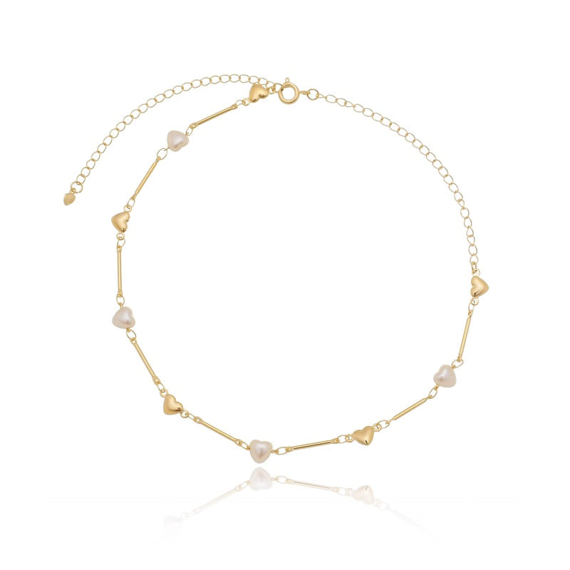 Colar Choker Palitinhos Corações Lisos E Pérolas Folheado a Ouro 18K