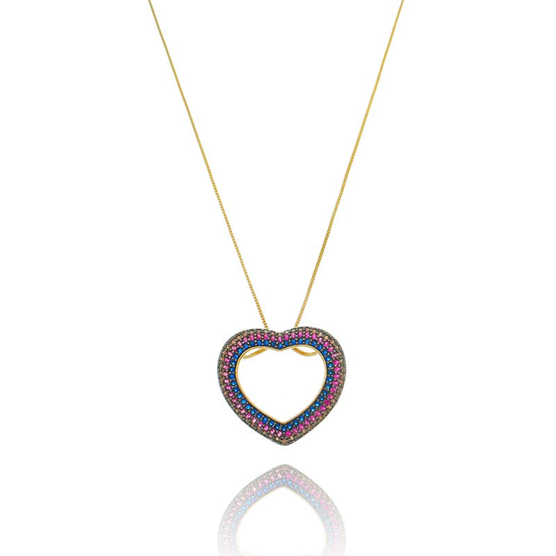 Colar Coração Cravejado Mega Vazado Rainbow Folheado a Ouro 18K