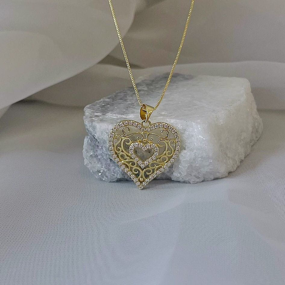 Colar Coração Vazado Arabescos Folheado a Ouro 18K