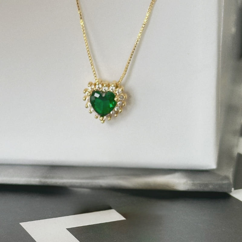 Colar Coração Verde com Borda Cravejada Folheado a Ouro 18k