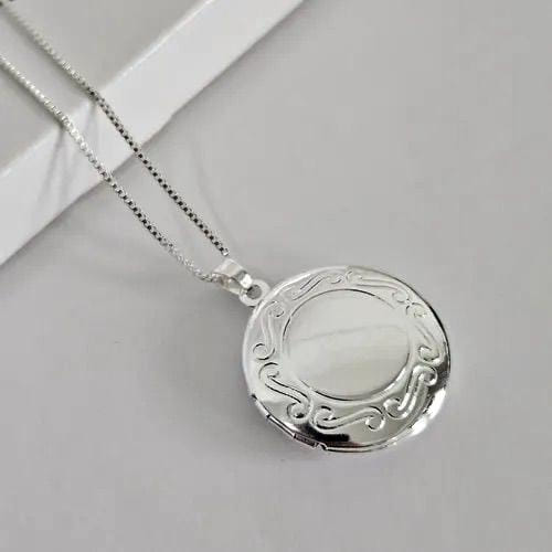 Colar de Relicário Redondo Arabescos Correntinha Folheado a prata 925