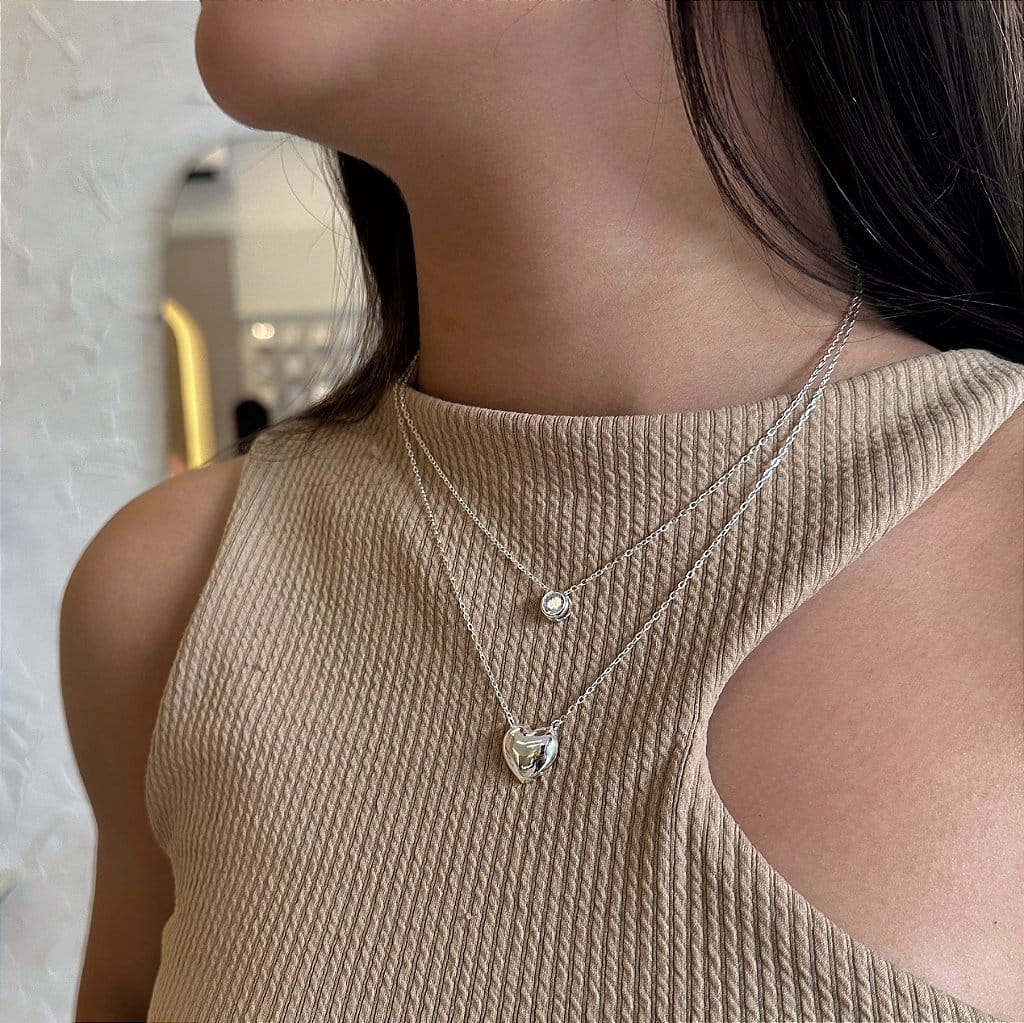 Colar Duplo Correntinha Ponto de Luz e Coração Liso Folheado a Prata 925
