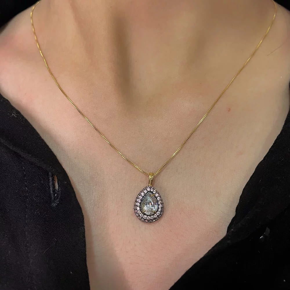 Colar Gota Cravejado Borda Rosa Folheado a Ouro 18K