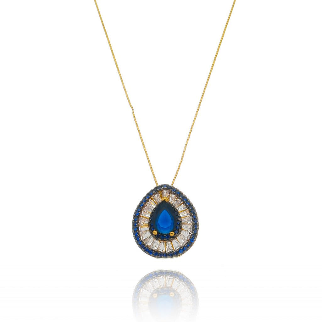 Colar Gota Navetes E Borda Cravejado Azul Folheado a Ouro 18K