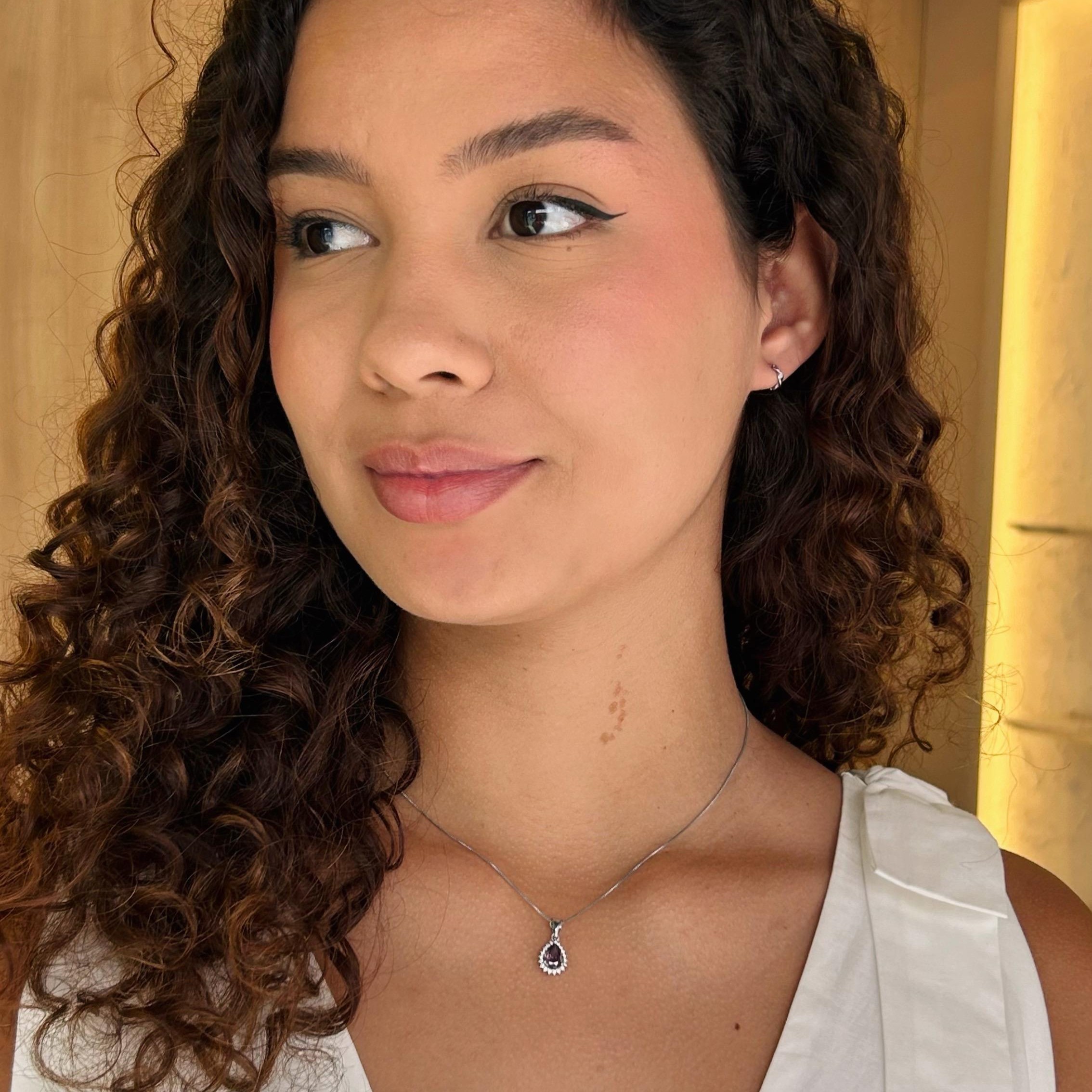 Colar Gota Zirconia Lilás e Borda Cravejada com Zirconias Cristal Steel