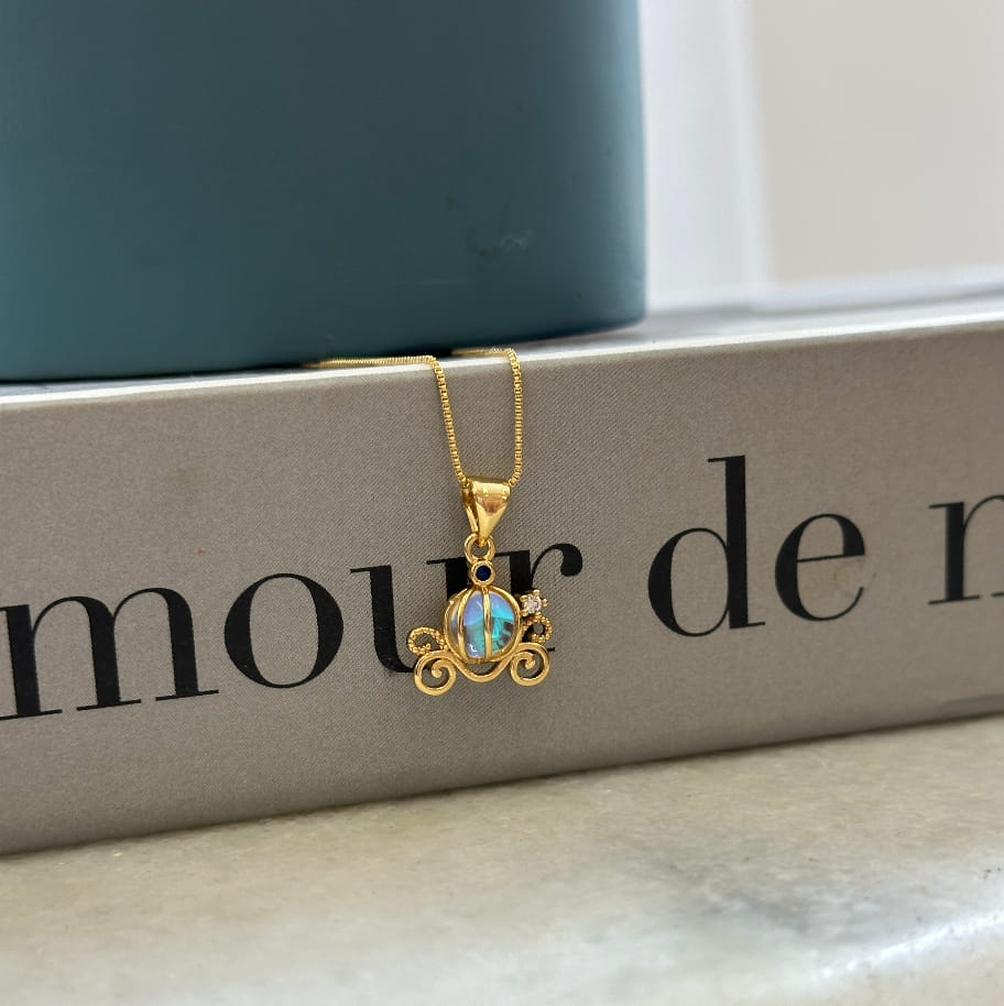 Folheado a Ouro 18K, o acabamento polido realça os detalhes intricados da carruagem e a beleza da pedra, garantindo durabilidade e um brilho refinado. Ideal para uso diário ou ocasiões especiais, este colar é uma escolha única para destacar o visual com um toque de romantismo e estilo.