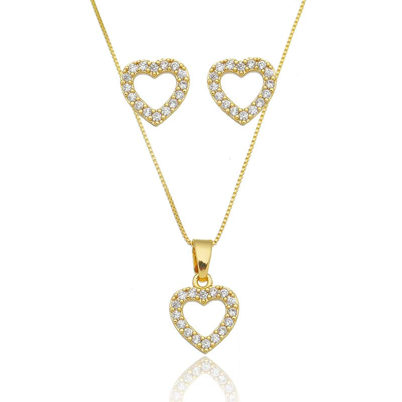 Conjunto Colar E Brinco Coração Vazado Folheado a Ouro 18K