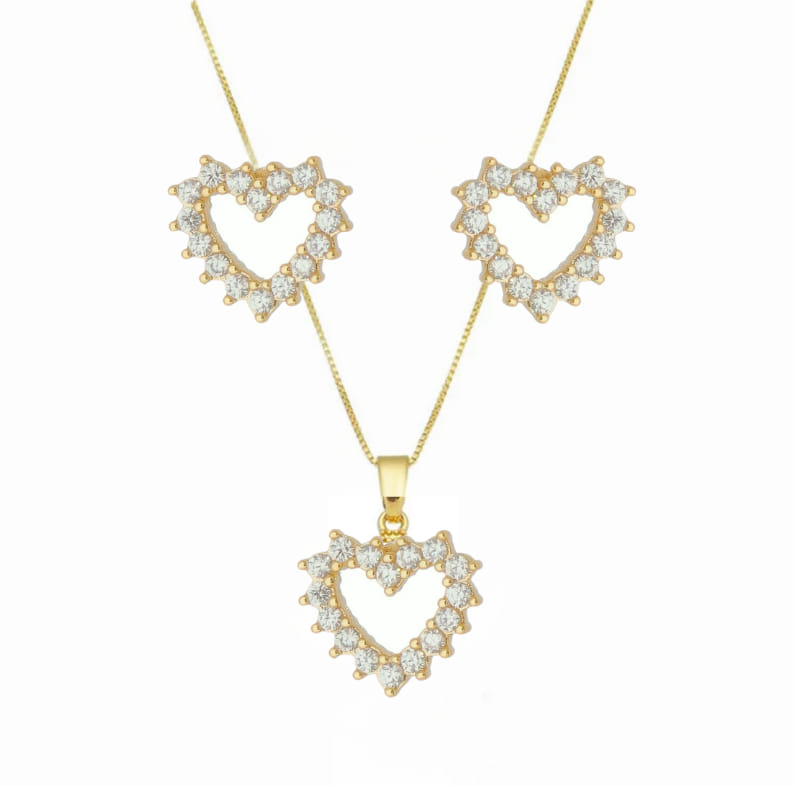 O Conjunto Coração Cravejado Vazado com Ponteiras, folheado a Ouro 18K, é uma combinação sofisticada e cheia de charme, ideal para quem busca um conjunto delicado que exale romantismo e elegância. Composto por um colar e um par de brincos em formato de coração vazado, ambos cravejados com zircônias brilhantes, este conjunto ilumina e valoriza qualquer visual.