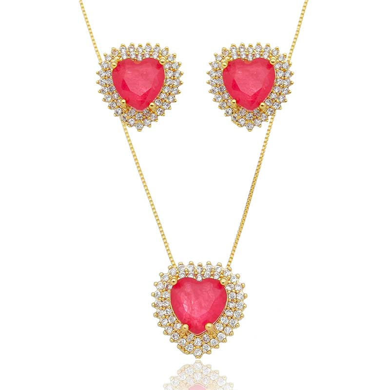 Conjunto Coração Rosa Com Borda Cravejado Folheado a Ouro 18K