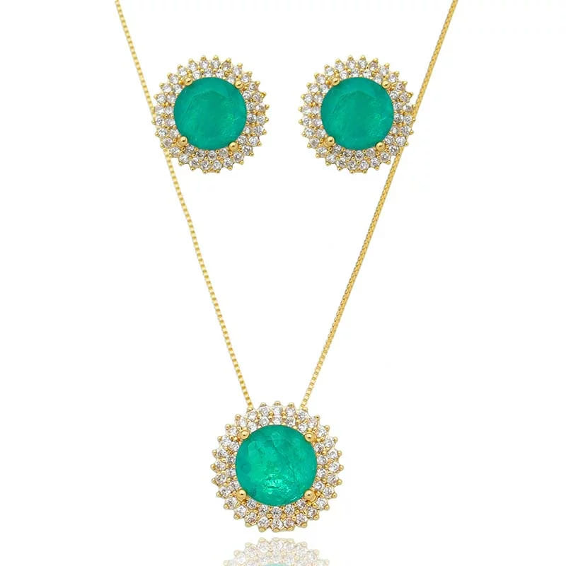 Conjunto Redondo Verde Com Borda Cravejado Folheado a Ouro 18K