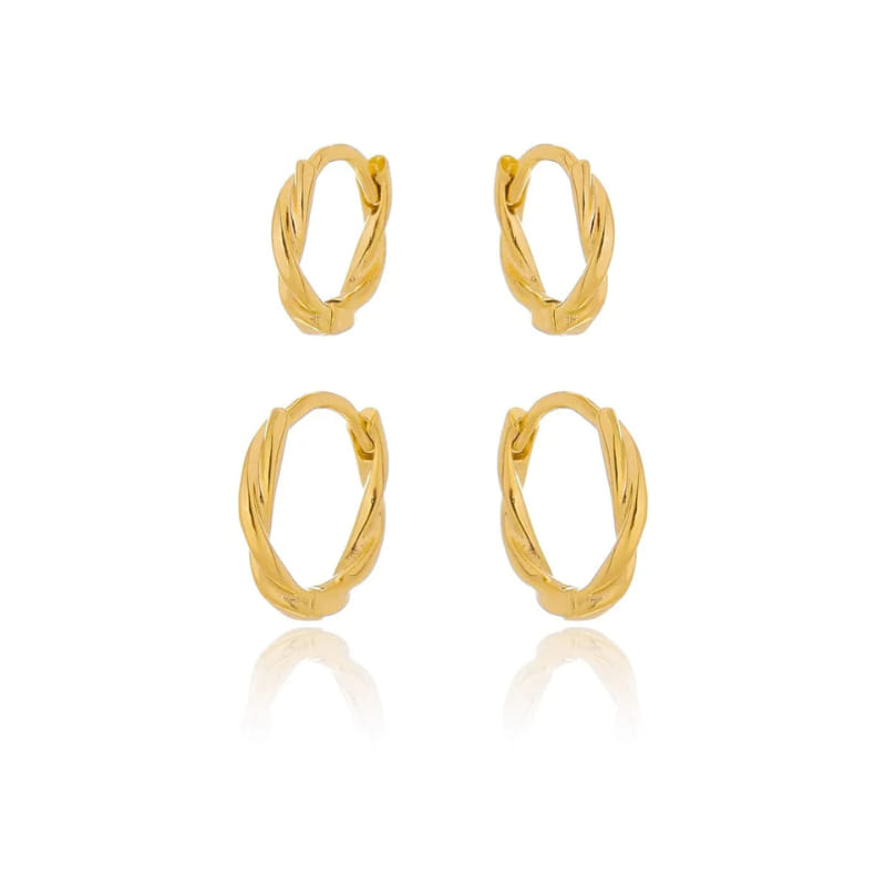 Folheado a Ouro 18K, o acabamento polido destaca os detalhes do fio torcido, conferindo brilho e refinamento às peças. Versátil, o conjunto permite criar diferentes combinações, podendo ser usado junto para um look impactante ou separado para produções mais discretas e minimalistas.