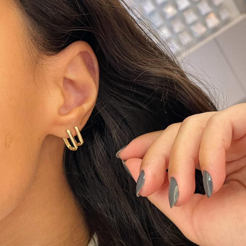 Moderno, elegante e super versátil, o Duo de Argolas Retangulares em Fio Liso Abaulado folheado a Ouro 18k é perfeito para quem ama acessórios com design clean e sofisticado.