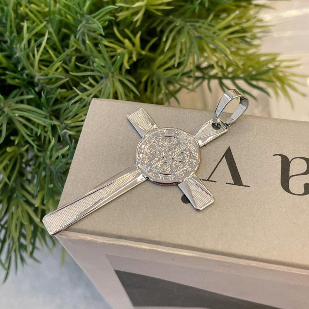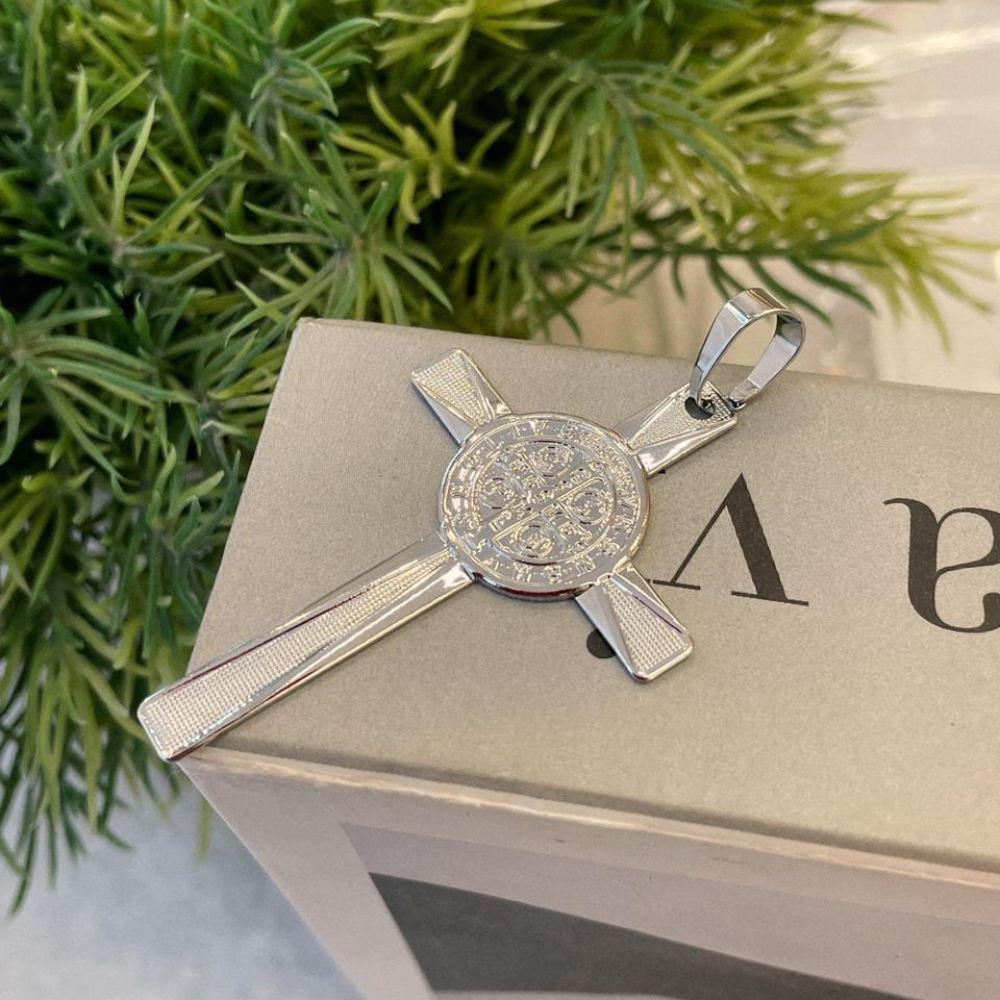 Clássico, elegante e cheio de significado, o Pingente Cruz com Medalha de São Bento folheado em Steel é perfeito para quem busca um acessório com forte valor espiritual e visual sofisticado.