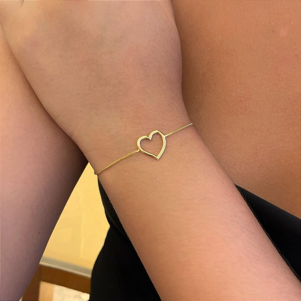 A Pulseira com Coração Liso Vazado Grande, folheada a Ouro 18K, é uma peça marcante e sofisticada, ideal para quem busca um acessório que combine elegância e simbolismo. O pingente em formato de coração grande e vazado traz um design minimalista e moderno, perfeito para quem aprecia peças que exalam charme e personalidade.