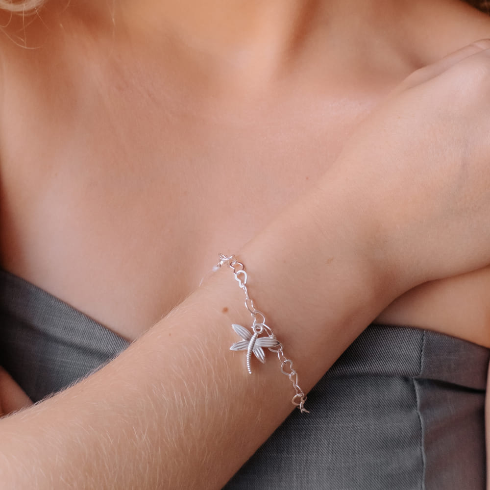 A Pulseira Corrente Coração com Pingente de Libélula, folheada a Prata 925, é uma peça de joalheria que exala delicadeza e simbolismo. Com uma corrente adornada por elos em formato de coração e um encantador pingente de libélula, esta pulseira oferece um visual romântico e elegante, perfeito para quem aprecia o charme da natureza e a elegância dos detalhes.
