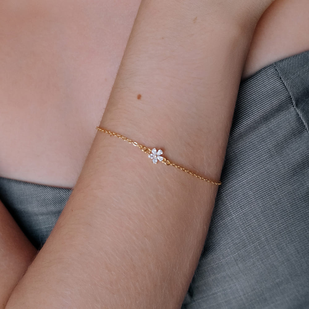 O pingente de flor traz um toque feminino e encantador, enquanto as zircônias acrescentam um brilho sofisticado que complementa o dourado do ouro 18k. Essa combinação faz da pulseira uma escolha ideal tanto para o dia a dia quanto para ocasiões especiais.