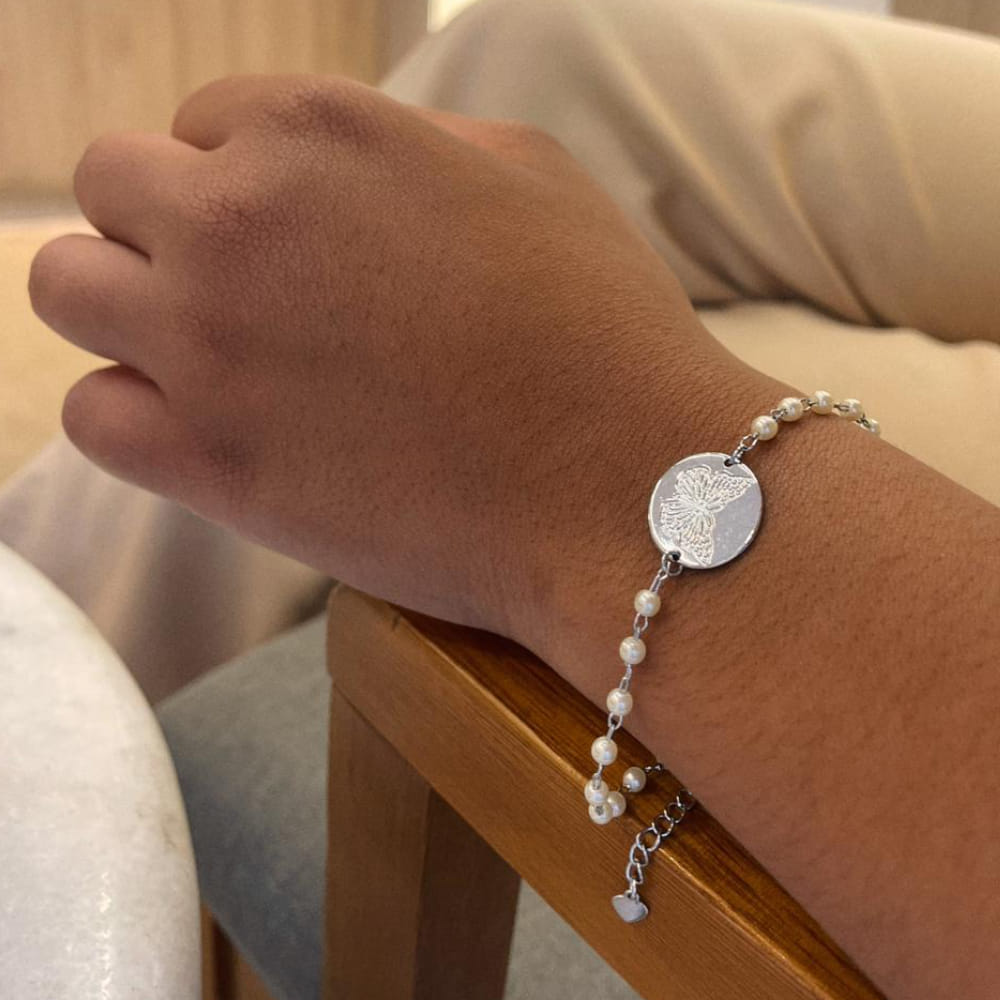 Delicada, romântica e cheia de significado, a Pulseira de Pérolas com Medalha de Borboleta folheada em Steel é perfeita para quem ama acessórios femininos com toque afetivo e visual elegante.